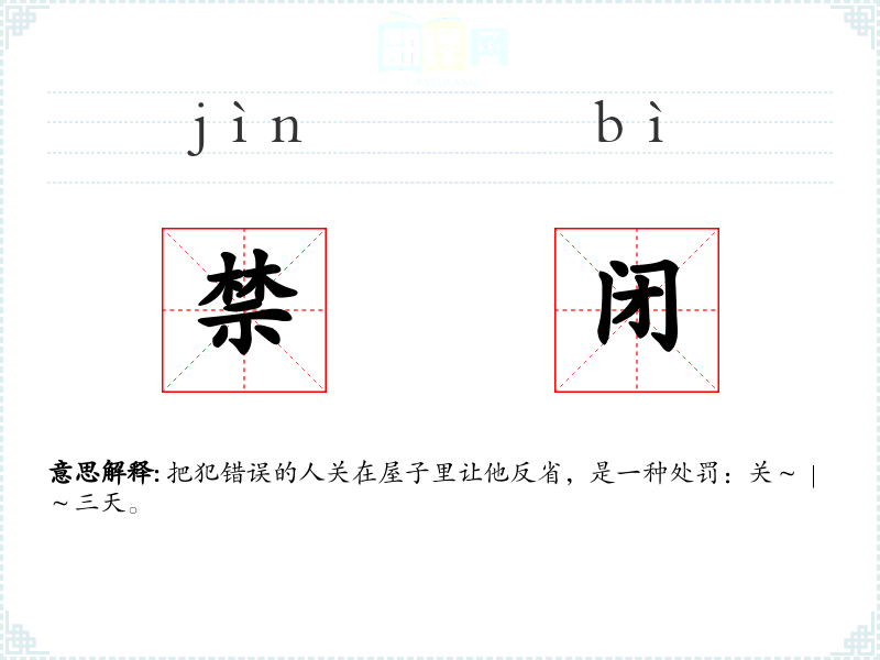 把犯错误的人关在屋子里让他反省,是一种处罚:关~|~三天。
