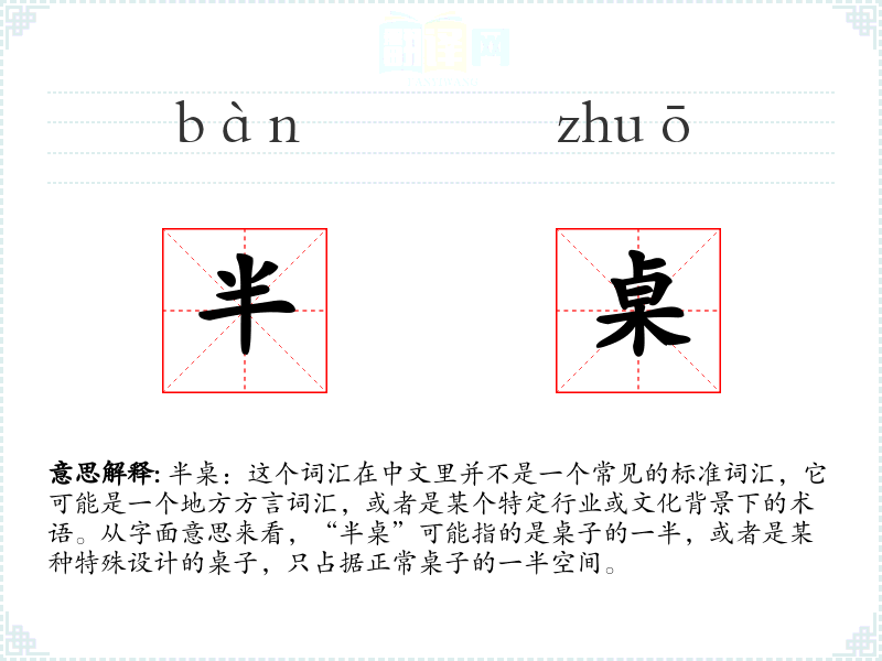 同义词:半桌的同义词可能包括“半尺寸桌子”、“小型桌子”等,具体取决于其使用场合。 反义词:半桌的反义词可能是“全尺寸桌子”或“标准桌子”。
