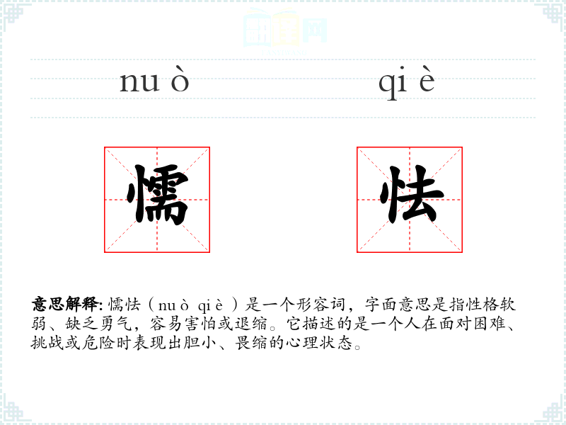 懦怯(nuò qiè)是一个形容词,字面意思是指性格软弱、缺乏勇气,容易害怕或退缩。它描述的是一个人在面对困难、挑战或危险时表现出胆小、畏缩的心理状态。