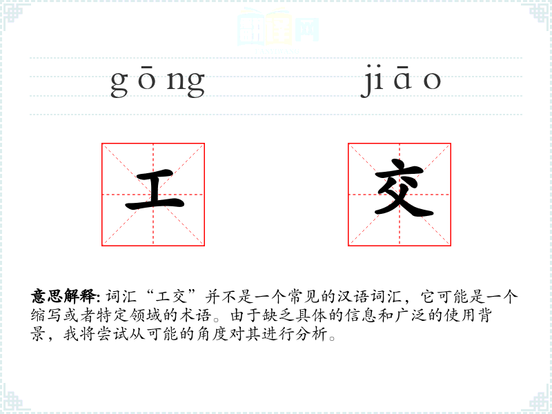 “工交”作为一个可能的缩写或专业术语,其使用范围相对有限,但在特定领域内可能具有重要的意义。在语言学习和表达中,了解这样的术语有助于更好地理解特定行业的语言特点。