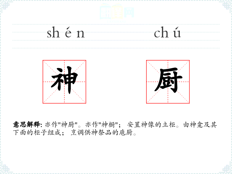 亦作"神厨"。亦作"神橱"; 安置神像的立柜。由神龛及其下面的柜子组成; 烹调供神祭品的庖厨。