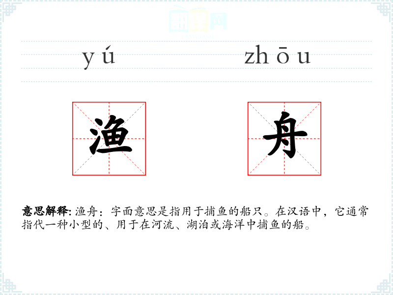 “渔舟”一词在汉语中历史悠久,其字面组合“渔”和“舟”分别指捕鱼和船只,组合起来即指捕鱼的船。在古代文学和绘画中,渔舟常被用作题材,反映了渔民的生活和自然风光。