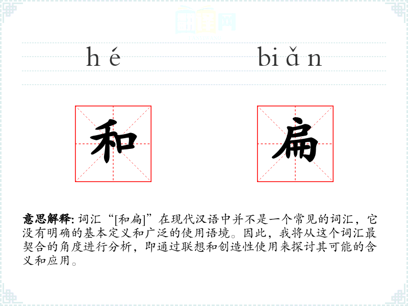 尽管“[和扁]”不是一个标准词汇,但通过联想和创造性使用,我们可以尝试赋予它一定的含义和应用。在语言学习和表达中,这种创造性的思维是非常重要的,它可以帮助我们更好地理解和运用语言。