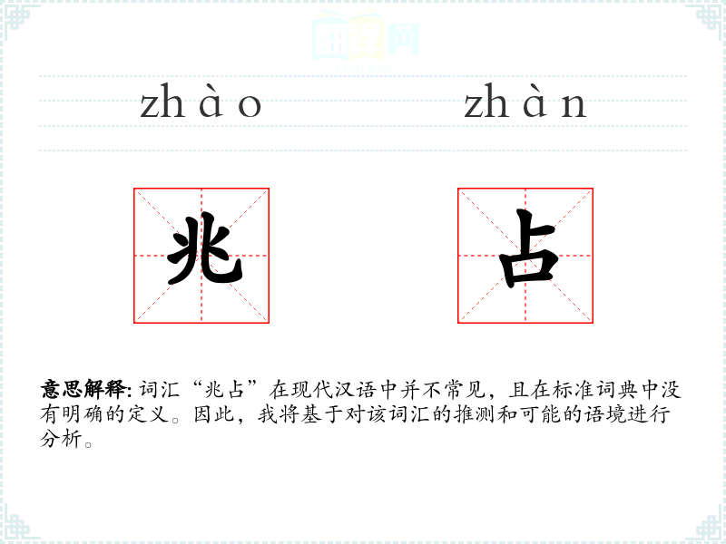 词汇“兆占”在现代汉语中并不常见,且在标准词典中没有明确的定义。因此,我将基于对该词汇的推测和可能的语境进行分析。