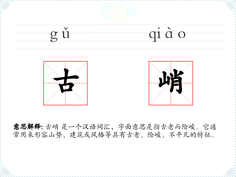 古峭 的词源较为直接,由“古”和“峭”两个字组成。其中,“古”表示古老,“峭”表示险峻。在古代汉语中,这两个字常被用来形容具有历史感和独特形态的事物。