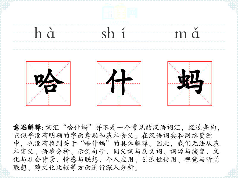 由于“哈什蚂”不是一个已知的词汇,我们无法提供上述各个方面的详细分析。如果您有其他词汇需要分析,请提供具体词汇,我们将很乐意为您提供详细的分析和解释。