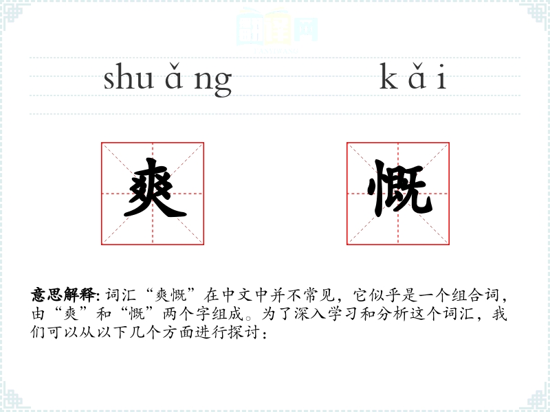 词汇“爽慨”在中文中并不常见,它似乎是一个组合词,由“爽”和“慨”两个字组成。为了深入学习和分析这个词汇,我们可以从以下几个方面进行探讨: