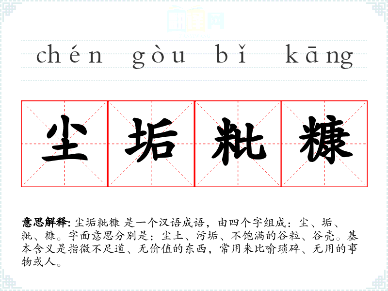 尘垢粃糠 是一个汉语成语,由四个字组成:尘、垢、粃、糠。字面意思分别是:尘土、污垢、不饱满的谷粒、谷壳。基本含义是指微不足道、无价值的东西,常用来比喻琐碎、无用的事物或人。