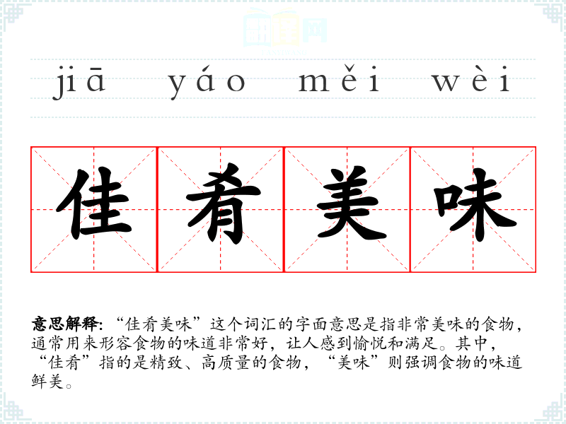 “佳肴美味”这个词汇的字面意思是指非常美味的食物,通常用来形容食物的味道非常好,让人感到愉悦和满足。其中,“佳肴”指的是精致、高质量的食物,“美味”则强调食物的味道鲜美。