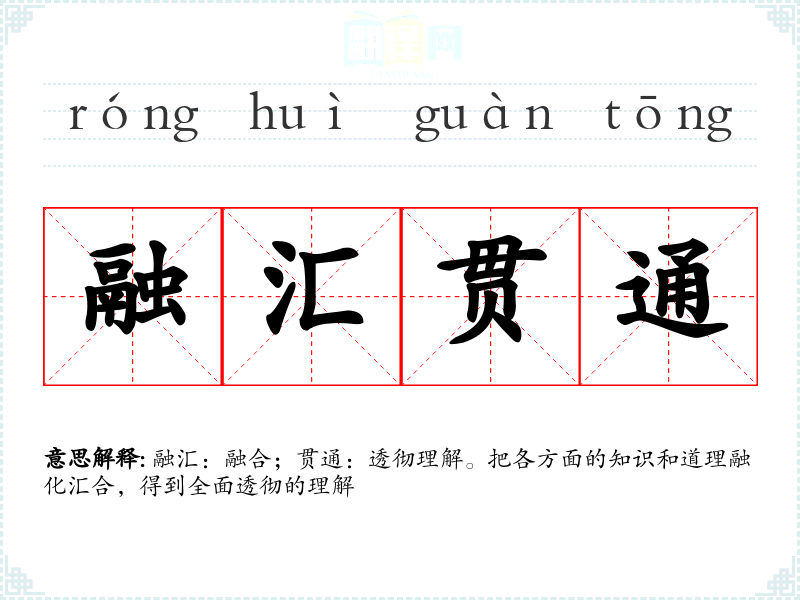 融汇:融合;贯通:透彻理解。把各方面的知识和道理融化汇合,得到全面透彻的理解