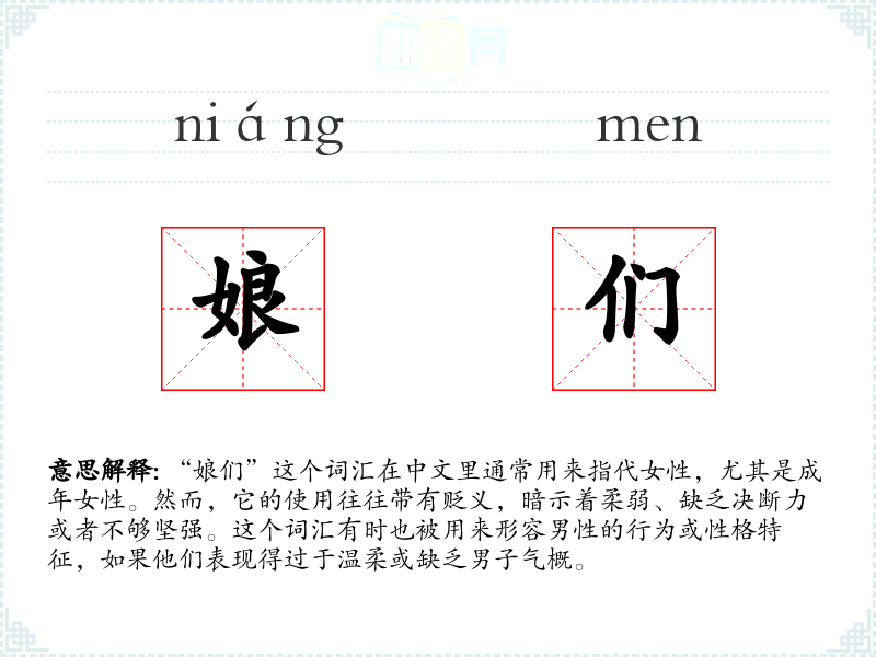 "娘们"的意思解释、娘们是什么意思由翻译网汉语词典查词提供。
