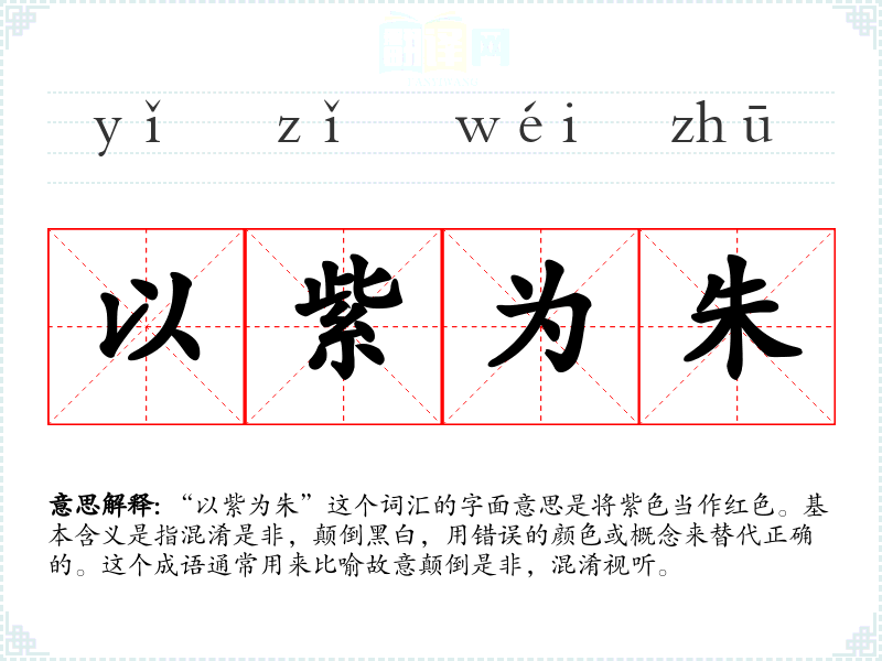 “以紫为朱”这个词汇的字面意思是将紫色当作红色。基本含义是指混淆是非,颠倒黑白,用错误的颜色或概念来替代正确的。这个成语通常用来比喻故意颠倒是非,混淆视听。