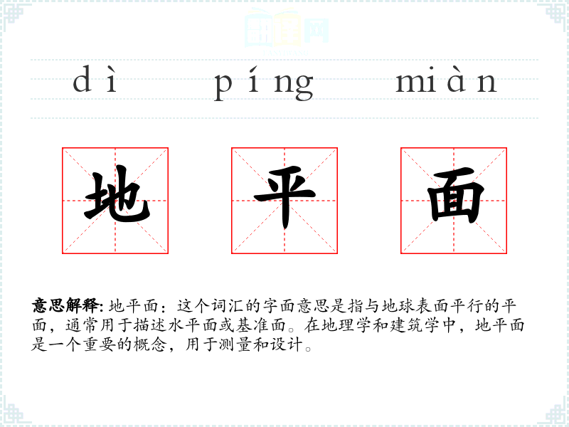 地平面:这个词汇的字面意思是指与地球表面平行的平面,通常用于描述水平面或基准面。在地理学和建筑学中,地平面是一个重要的概念,用于测量和设计。