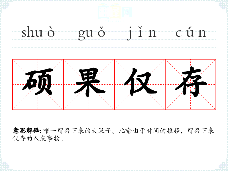 唯一留存下来的大果子。比喻由于时间的推移,留存下来仅存的人或事物。