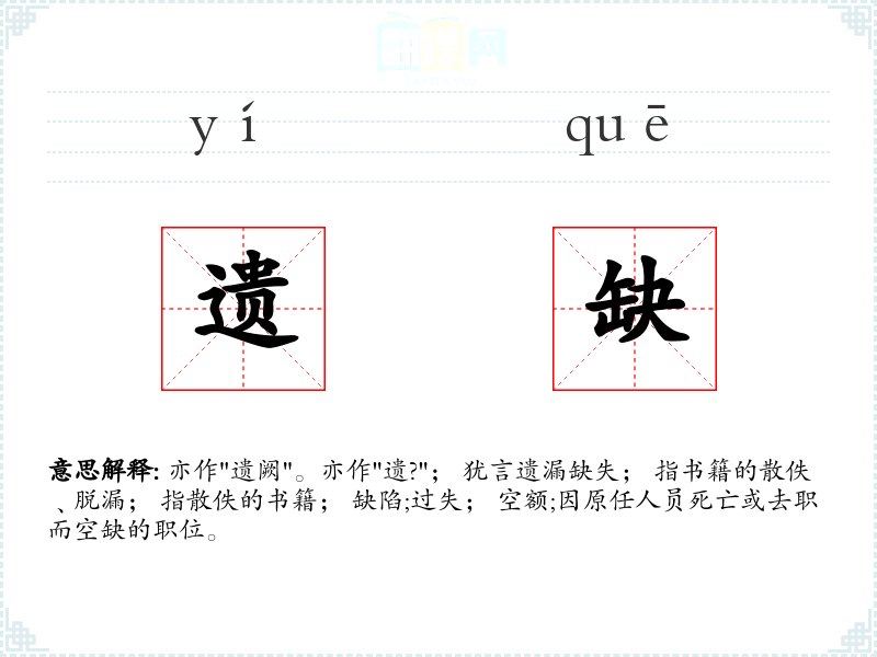 亦作"遗阙"。亦作"遗?"; 犹言遗漏缺失; 指书籍的散佚﹑脱漏; 指散佚的书籍; 缺陷;过失; 空额;因原任人员死亡或去职而空缺的职位。