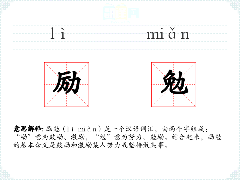 励勉(lì miǎn)是一个汉语词汇,由两个字组成:“励”意为鼓励、激励,“勉”意为努力、勉励。结合起来,励勉的基本含义是鼓励和激励某人努力或坚持做某事。