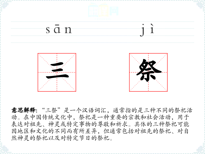 - 反义词:无(因为“三祭”是一个特定且具体的概念,通常没有直接的反义词)