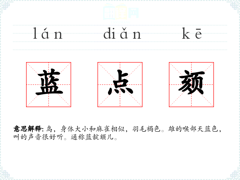 鸟,身体大小和麻雀相似,羽毛褐色。雄的喉部天蓝色,叫的声音很好听。通称蓝靛颏儿。