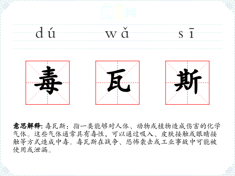 毒瓦斯:指一类能够对人体、动物或植物造成伤害的化学气体。这些气体通常具有毒性,可以通过吸入、皮肤接触或眼睛接触等方式造成中毒。毒瓦斯在战争、恐怖袭击或工业事故中可能被使用或泄漏。