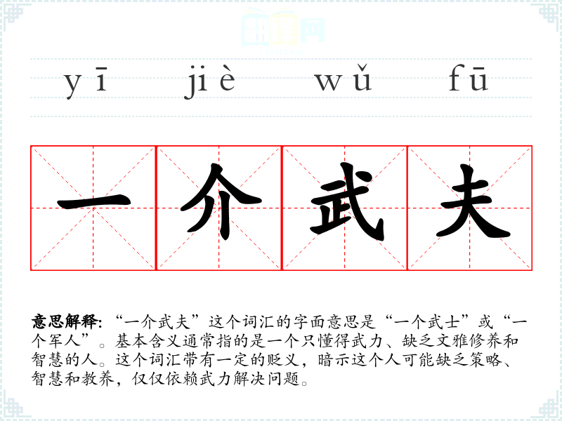 “一介武夫”这个词汇的字面意思是“一个武士”或“一个军人”。基本含义通常指的是一个只懂得武力、缺乏文雅修养和智慧的人。这个词汇带有一定的贬义,暗示这个人可能缺乏策略、智慧和教养,仅仅依赖武力解决问题。