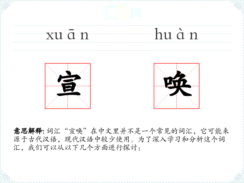 词汇“宣唤”在中文里并不是一个常见的词汇,它可能来源于古代汉语,现代汉语中较少使用。为了深入学*和分析这个词汇,我们可以从以下几个方面进行探讨: