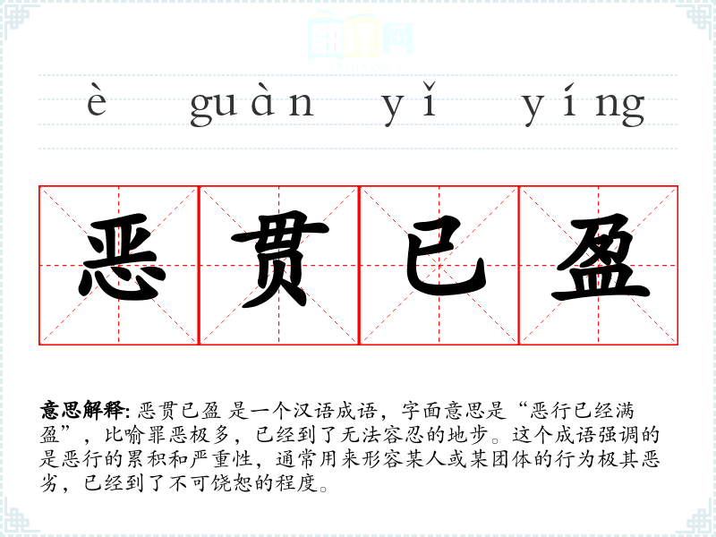 恶贯已盈 是一个汉语成语,字面意思是“恶行已经满盈”,比喻罪恶极多,已经到了无法容忍的地步。这个成语强调的是恶行的累积和严重性,通常用来形容某人或某团体的行为极其恶劣,已经到了不可饶恕的程度。