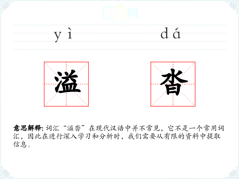 词汇“溢沓”在现代汉语中并不常见,它不是一个常用词汇,因此在进行深入学习和分析时,我们需要从有限的资料中提取信息。