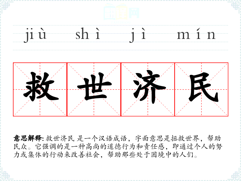 救世济民 是一个汉语成语,字面意思是拯救世界,帮助民众。它强调的是一种高尚的道德行为和责任感,即通过个人的努力或集体的行动来改善社会,帮助那些处于困境中的人们。
