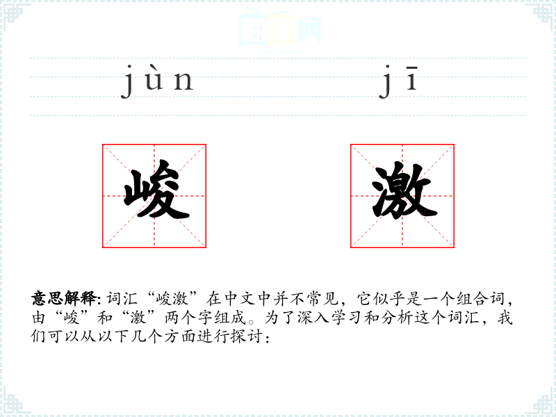词汇“峻激”在中文中并不常见,它似乎是一个组合词,由“峻”和“激”两个字组成。为了深入学*和分析这个词汇,我们可以从以下几个方面进行探讨: