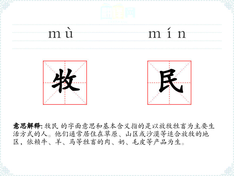 同义词:放牧者、牧羊人、牧马人 反义词:农夫、种植者、园丁(这些词汇通常与耕作和种植相关,与牧民的放牧生活方式相对)