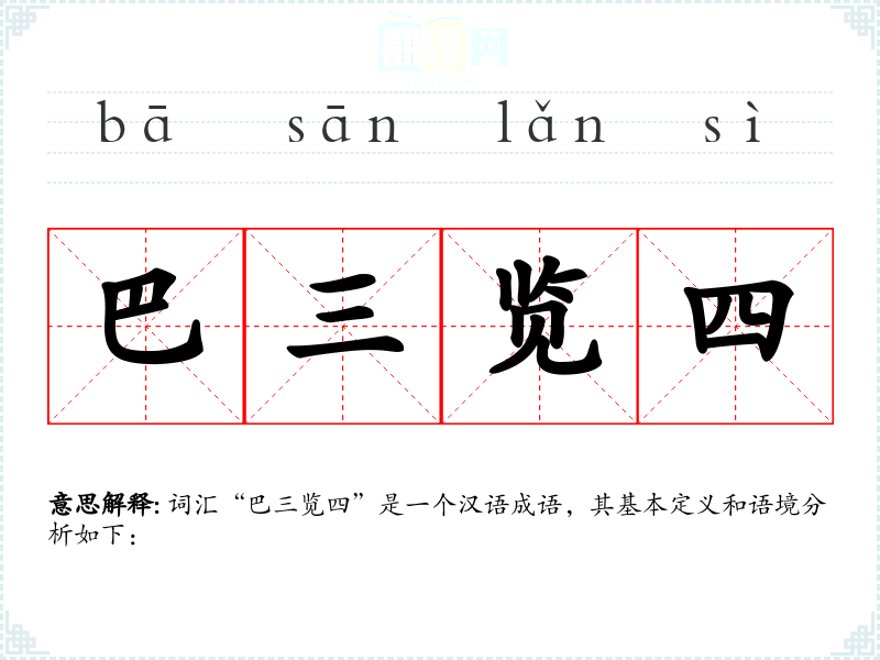 词汇“巴三览四”是一个汉语成语,其基本定义和语境分析如下: