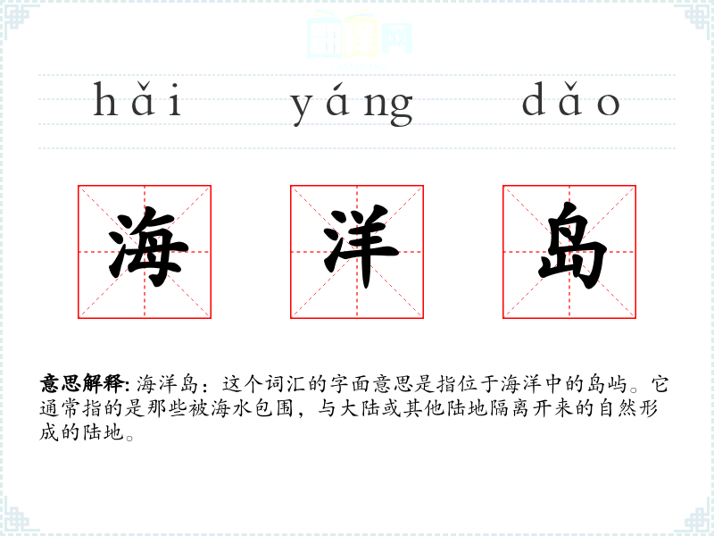 海洋岛:这个词汇的字面意思是指位于海洋中的岛屿。它通常指的是那些被海水包围,与大陆或其他陆地隔离开来的自然形成的陆地。