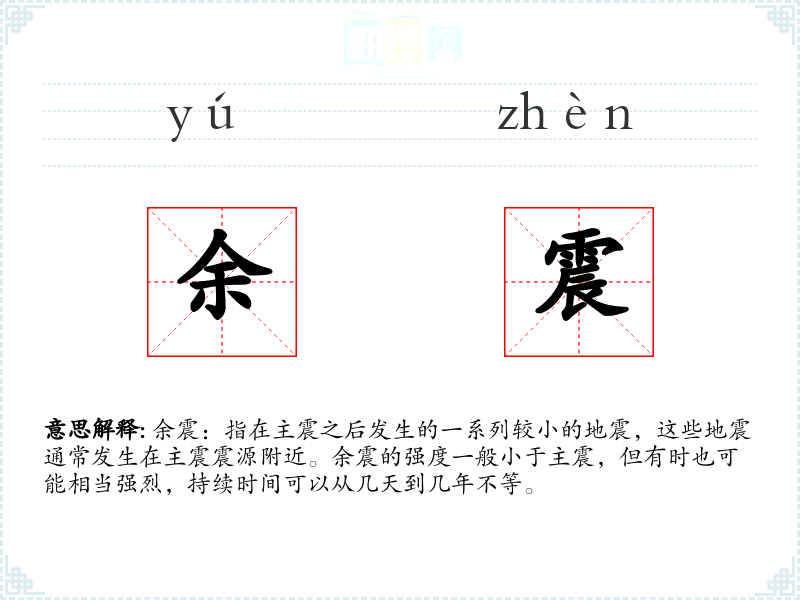 余震一词由“余”和“震”组成。“余”字在这里表示剩余或后续的意思,“震”字表示震动或地震。这个词在中文里有着悠久的历史,直接反映了地震现象的后续效应。