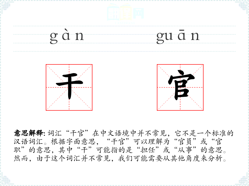 由于“干官”不是一个标准词汇,我们无法给出一个确切的基本定义。它可能是某个特定领域或方言中的词汇,或者是某个特定历史时期的用语。