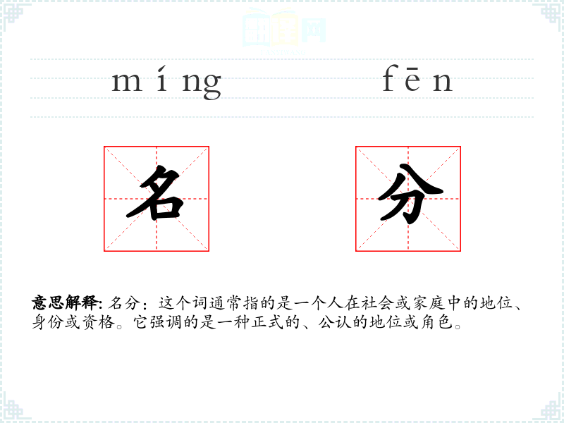 名分:这个词通常指的是一个人在社会或家庭中的地位、身份或资格。它强调的是一种正式的、公认的地位或角色。