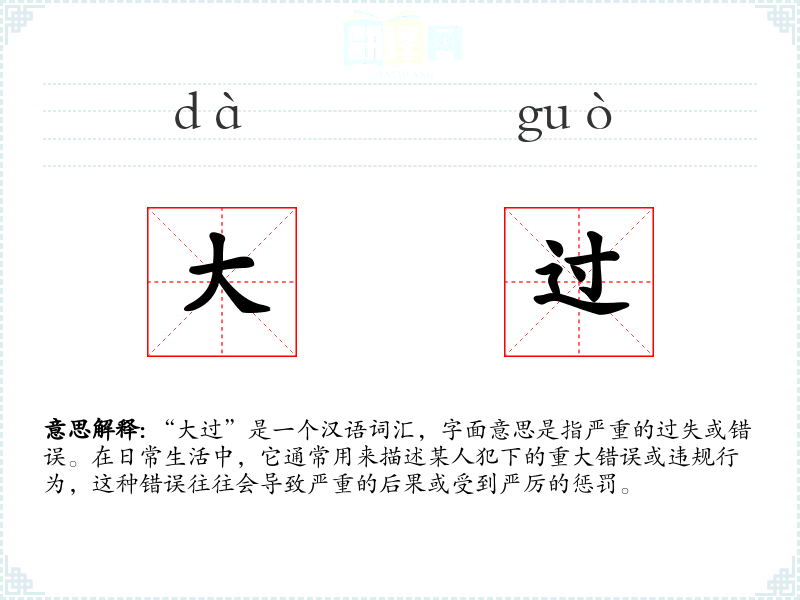 “大过”是一个汉语词汇,字面意思是指严重的过失或错误。在日常生活中,它通常用来描述某人犯下的重大错误或违规行为,这种错误往往会导致严重的后果或受到严厉的惩罚。