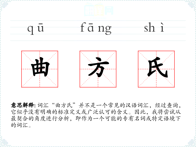 词汇“曲方氏”并不是一个常见的汉语词汇,经过查询,它似乎没有明确的标准定义或广泛认可的含义。因此,我将尝试从最契合的角度进行分析,即作为一个可能的专有名词或特定语境下的词汇。