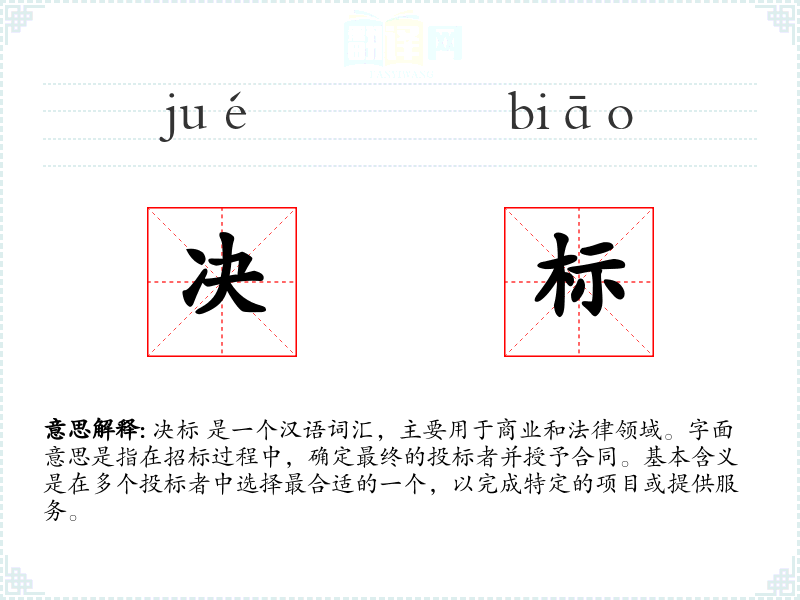 决标 是一个汉语词汇,主要用于商业和法律领域。字面意思是指在招标过程中,确定最终的投标者并授予合同。基本含义是在多个投标者中选择最合适的一个,以完成特定的项目或提供服务。