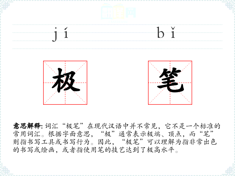 词汇“极笔”在现代汉语中并不常见,它不是一个标准的常用词汇。根据字面意思,“极”通常表示极端、顶点,而“笔”则指书写工具或书写行为。因此,“极笔”可以理解为指非常出色的书写或绘画,或者指使用笔的技艺达到了极高水平。