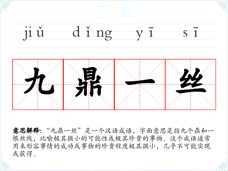 “九鼎一丝”是一个汉语成语,字面意思是指九个鼎和一根丝线,比喻极其微小的可能性或极其珍贵的事物。这个成语通常用来形容事情的成功或事物的珍贵程度极其微小,几乎不可能实现或获得。