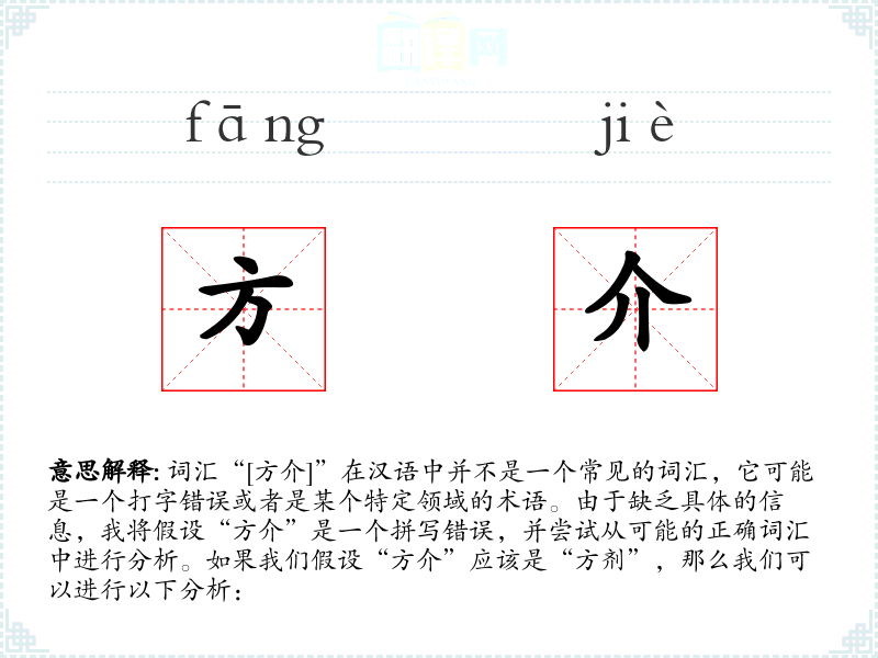 词汇“[方介]”在汉语中并不是一个常见的词汇,它可能是一个打字错误或者是某个特定领域的术语。由于缺乏具体的信息,我将假设“方介”是一个拼写错误,并尝试从可能的正确词汇中进行分析。如果我们假设“方介”应该是“方剂”,那么我们可以进行以下分析: