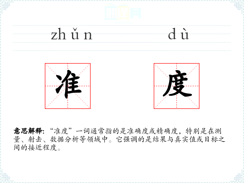 “准度”一词源自汉语,由“准”和“度”两个字组成。“准”有标准、规则的意思,“度”则表示程度或量度。在现代汉语中,“准度”主要用于描述精确性和准确性。