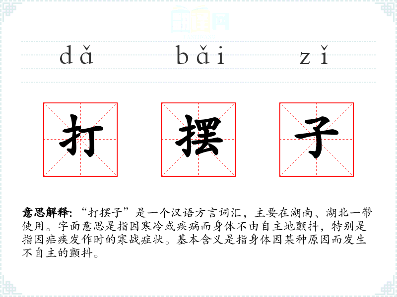 “打摆子”是一个汉语方言词汇,主要在湖南、湖北一带使用。字面意思是指因寒冷或疾病而身体不由自主地颤抖,特别是指因疟疾发作时的寒战症状。基本含义是指身体因某种原因而发生不自主的颤抖。