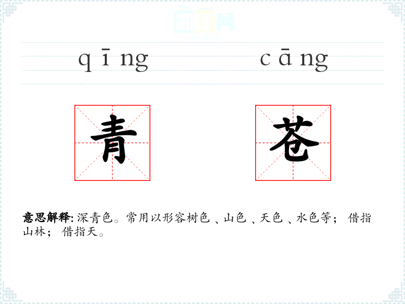 深青色。常用以形容树色﹑山色﹑天色﹑水色等; 借指山林; 借指天。