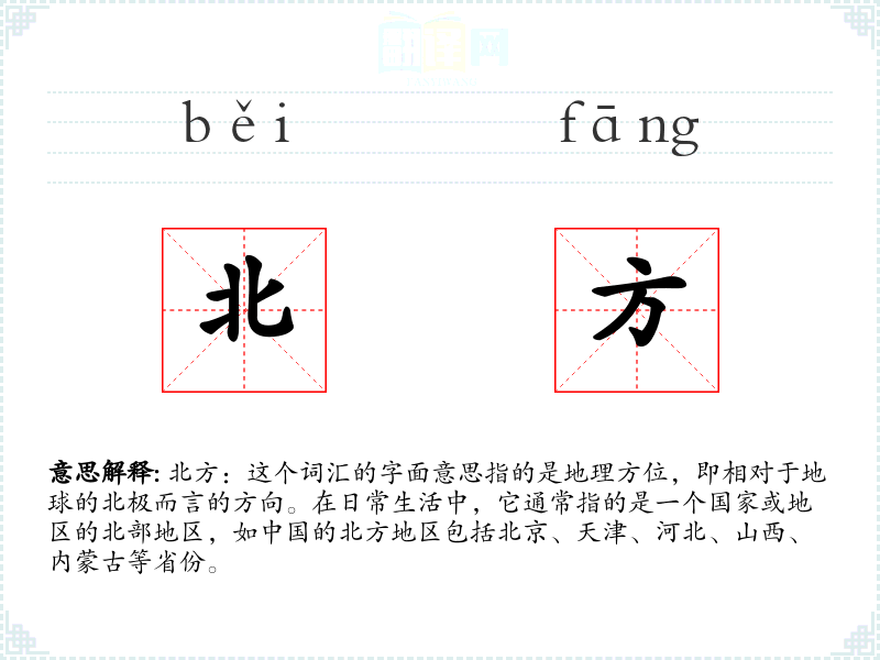“北方”一词在中文中历史悠久,其字面构成“北”和“方”分别代表方向和位置。在古代文献中,如《诗经》、《尚书》中已有使用,其含义和现代基本一致。