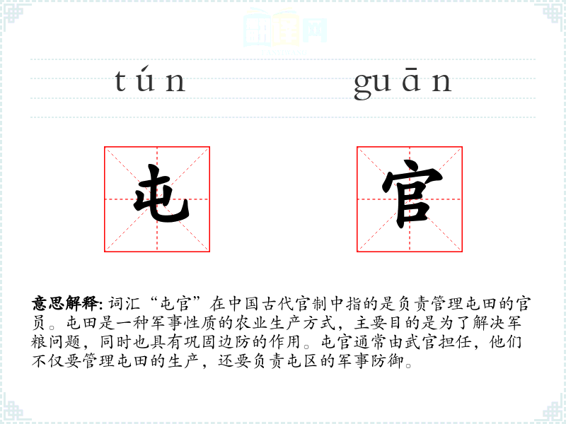 同义词:屯田官、屯长 反义词:文官(相对于武官而言)