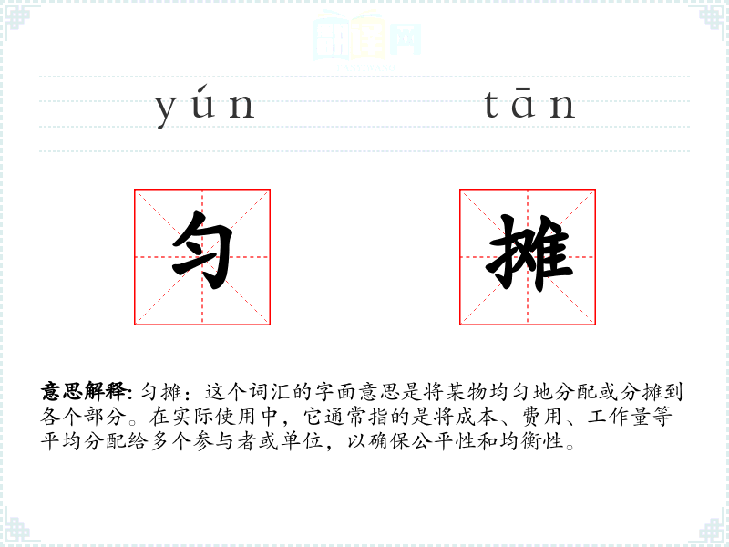 匀摊:这个词汇的字面意思是将某物均匀地分配或分摊到各个部分。在实际使用中,它通常指的是将成本、费用、工作量等平均分配给多个参与者或单位,以确保公平性和均衡性。