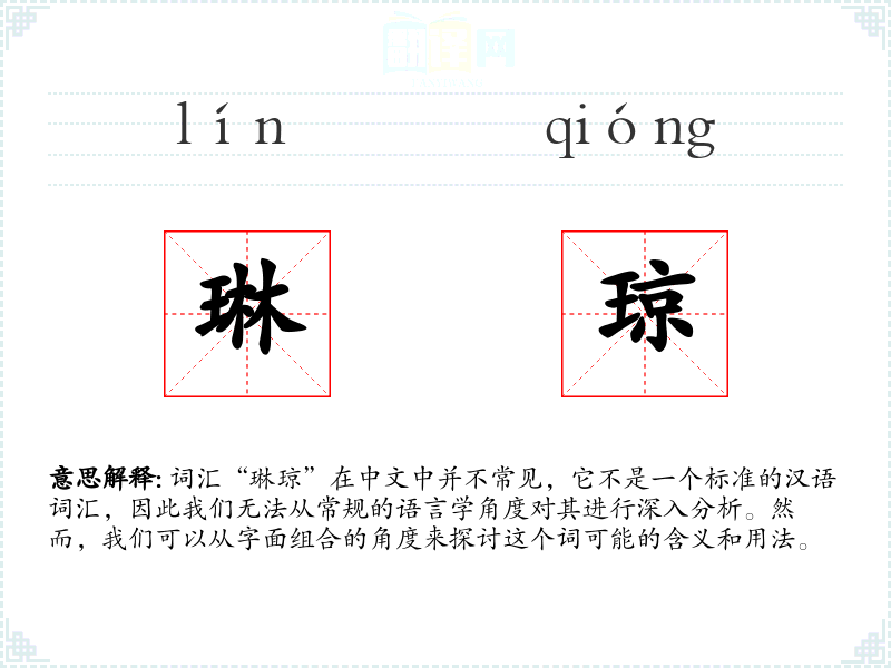 词汇“琳琼”在中文中并不常见,它不是一个标准的汉语词汇,因此我们无法从常规的语言学角度对其进行深入分析。然而,我们可以从字面组合的角度来探讨这个词可能的含义和用法。