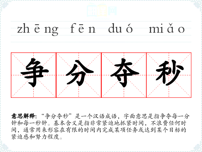 “争分夺秒”是一个汉语成语,字面意思是指争夺每一分钟和每一秒钟。基本含义是指非常紧迫地抓紧时间,不浪费任何时间,通常用来形容在有限的时间内完成某项任务或达到某个目标的紧迫感和努力程度。