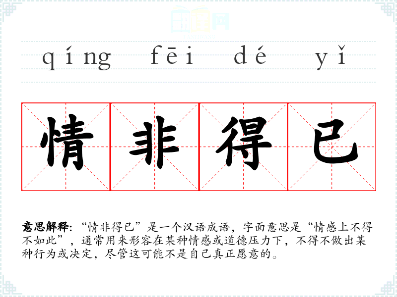 “情非得已”是一个汉语成语,字面意思是“情感上不得不如此”,通常用来形容在某种情感或道德压力下,不得不做出某种行为或决定,尽管这可能不是自己真正愿意的。